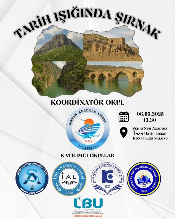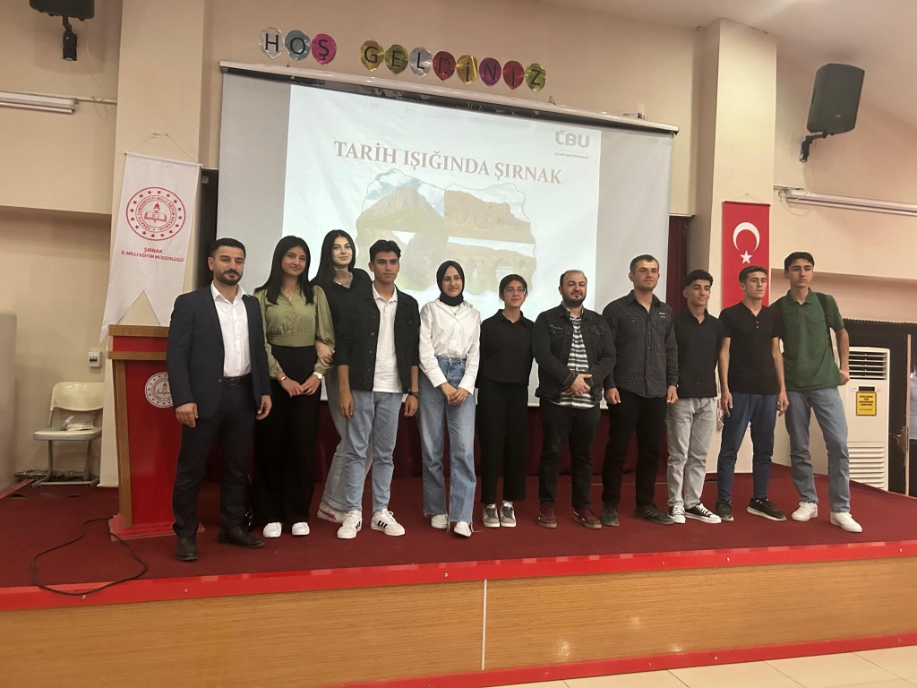 "Liselerde Bilim Uygulamaları" programı kapsamında okulumuzun koordinatörlüğü ve ilçelerimizden okullarında katılımı ile "Tarih Işığında Şırnak" konferansımızı gerçekleştirdik. Okulumuz öğrencileri ve katılımcı okullardan gelen öğrenciler ilimizin tarihini, güzelliklerini, kültürünü sundular. Sunumlar için ögrencilerimize, katılım gösteren okullardan öğretmenlerimize emekleri için teşekkür ederiz.